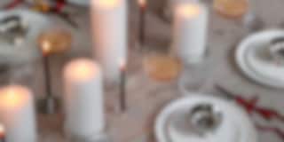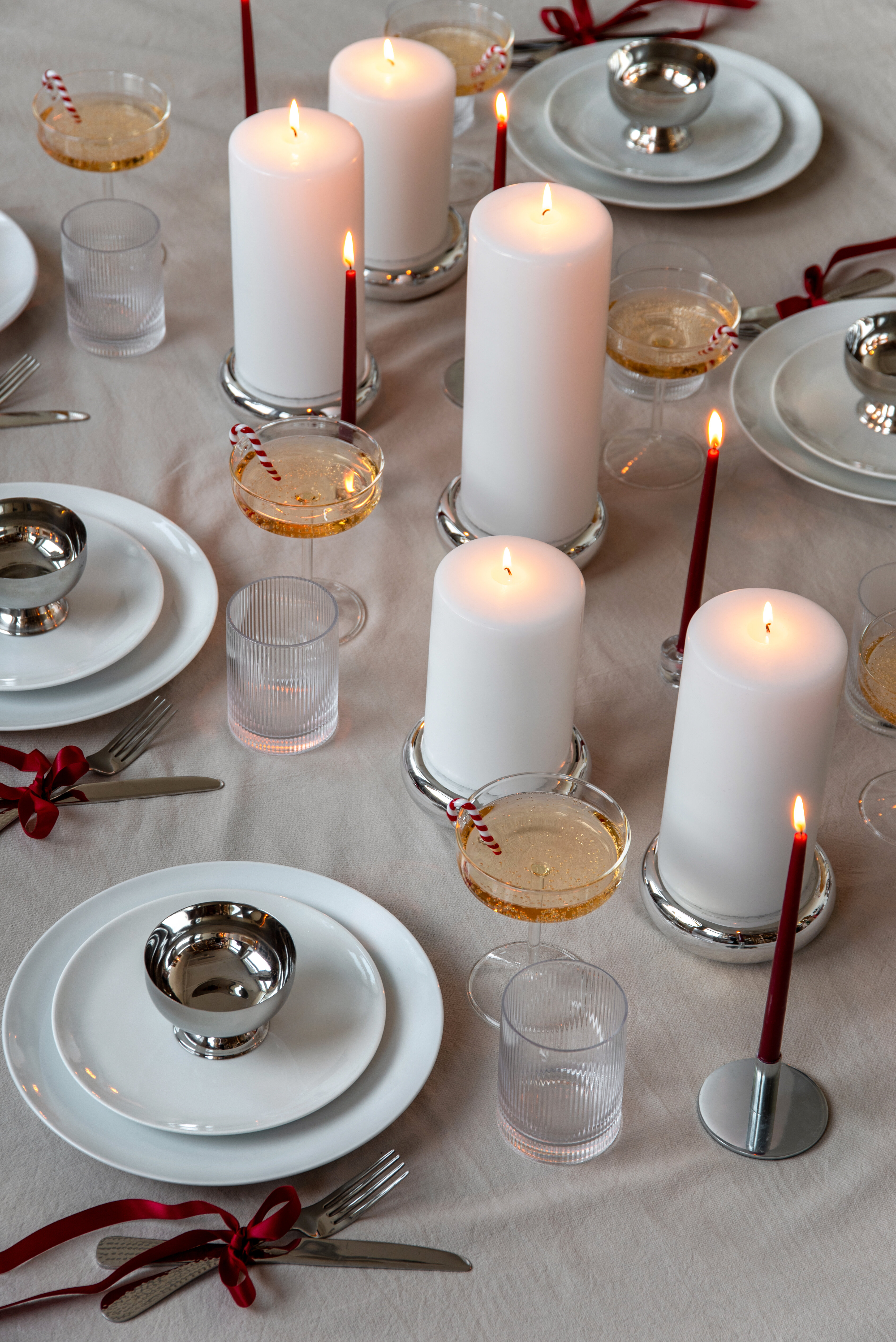 En elegant vinterborddekking med høye hvite blokklys, mørkerøde kronelys og glitrende detaljer som skaper et stilrent uttrykk. Glass, sølvdetaljer og myke tekstiler gir bordet en moderne og festlig stemning – den perfekte kombinasjonen for både adventsmiddag og nyttårsskål.