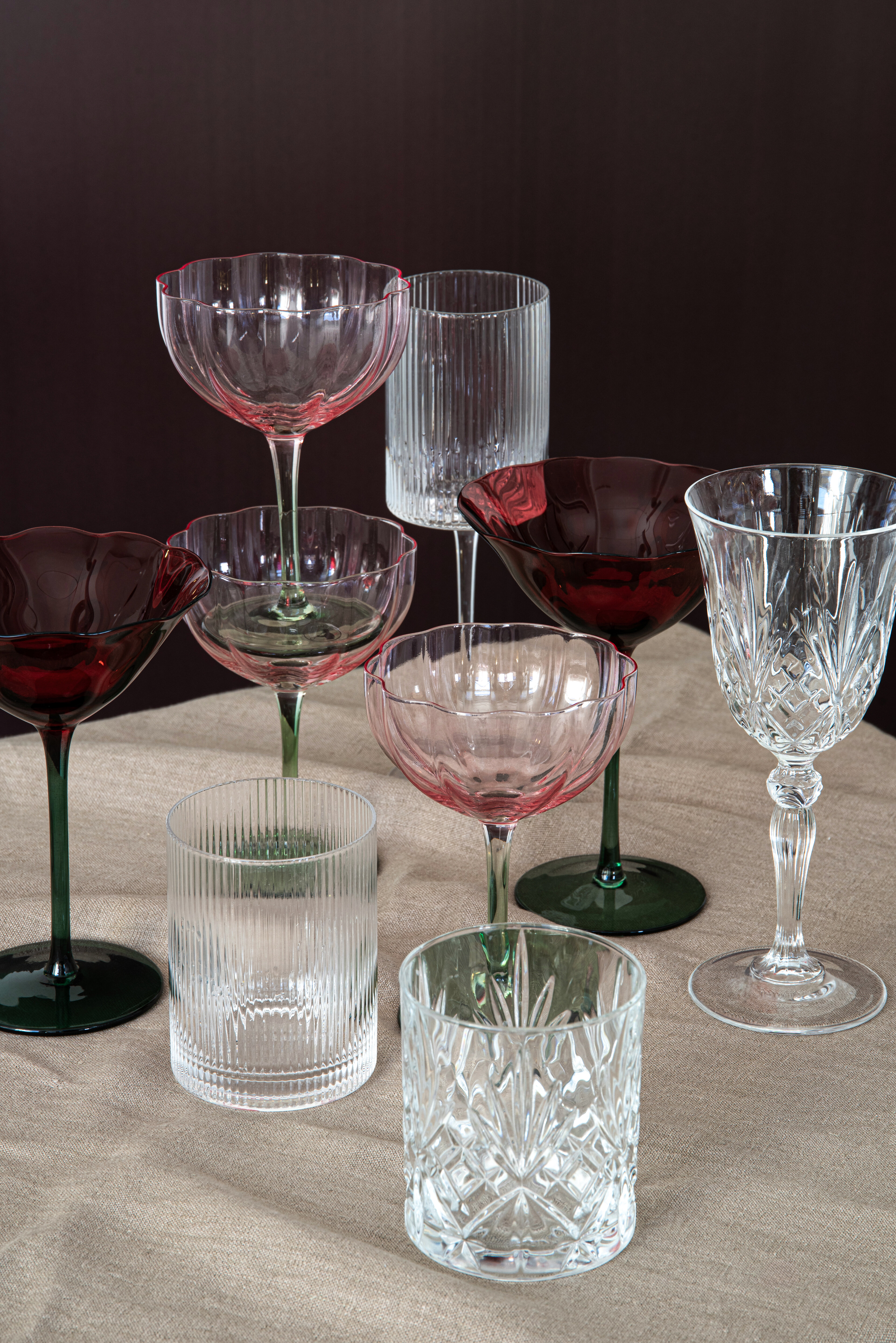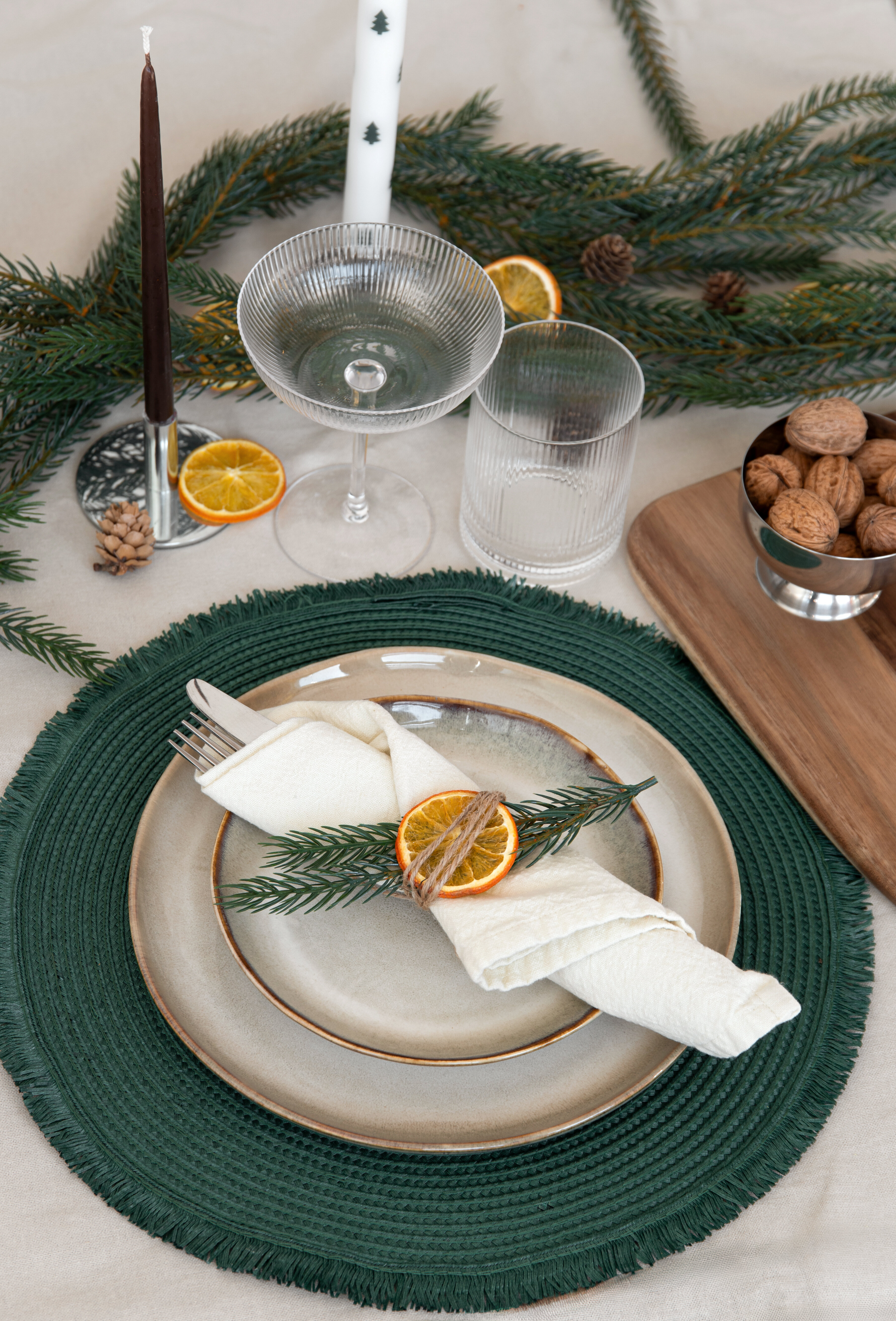 Denne borddekkingen er en fin kombinasjon av klassiske og tidløse detaljer. Bordbrikken i myke nyanser gir en god base, mens sølvdetaljer og riflede glass skaper en trendy og gjennomført helhet. Treslagene og de enkle tilbehørene gjør borddekkingen innbydende.