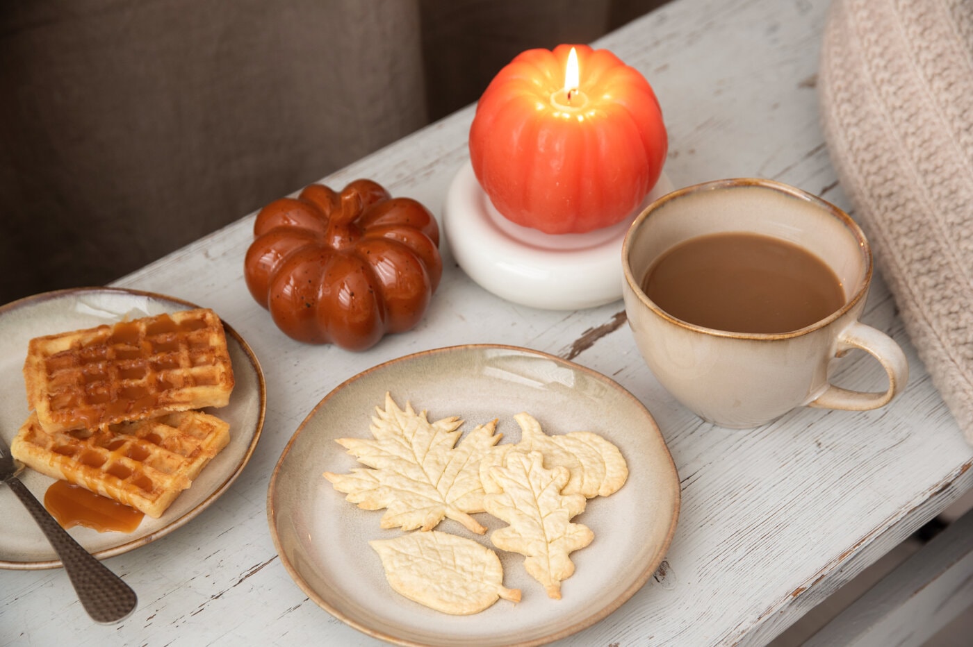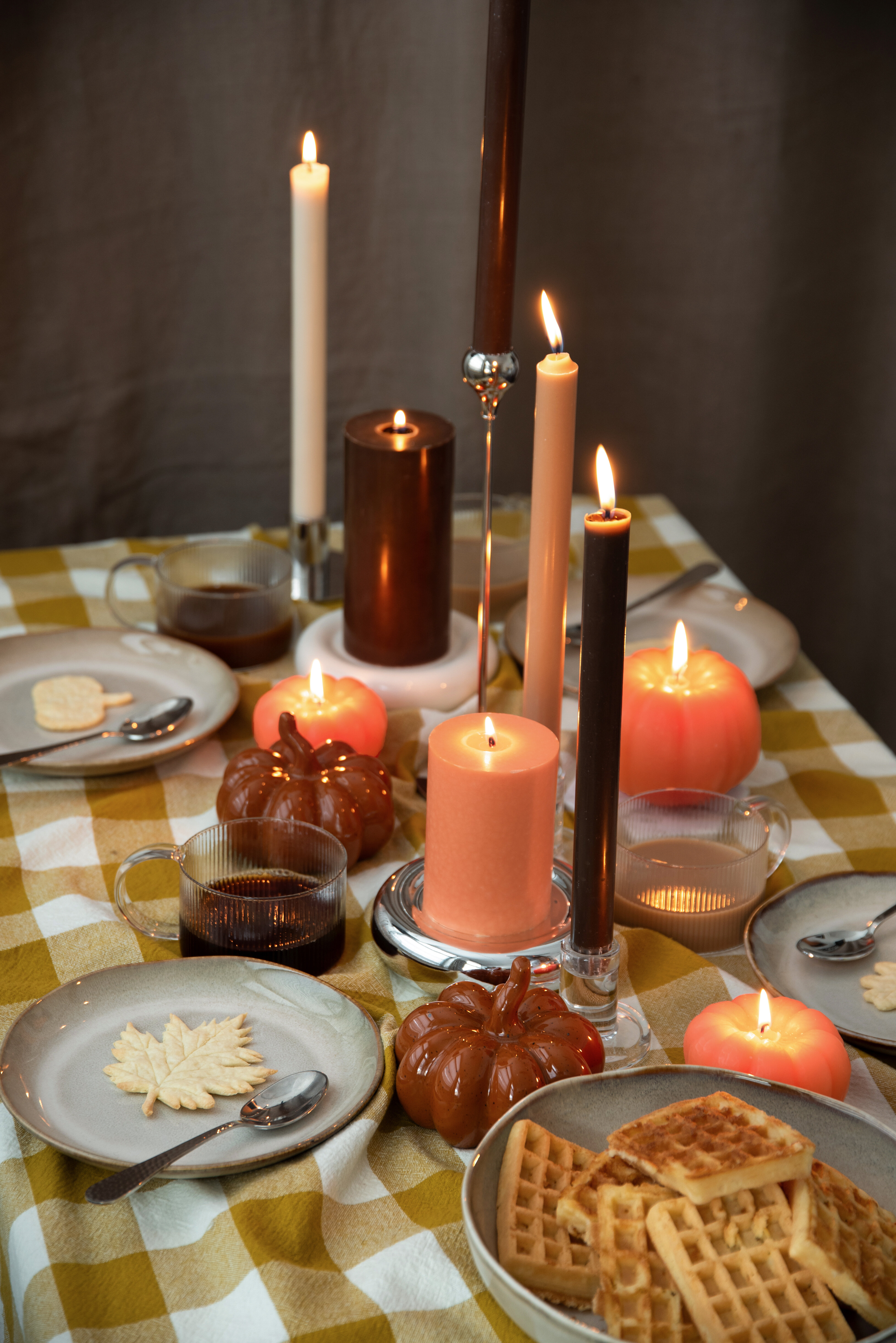 Rutete duker, jordnære toner, gresskar og levende lys skaper en følelse av varme og forankring i sesongen. Ved å legge til små, personlige elementer – som kjeks formet som blader – blir bordet både innbydende og minneverdig.