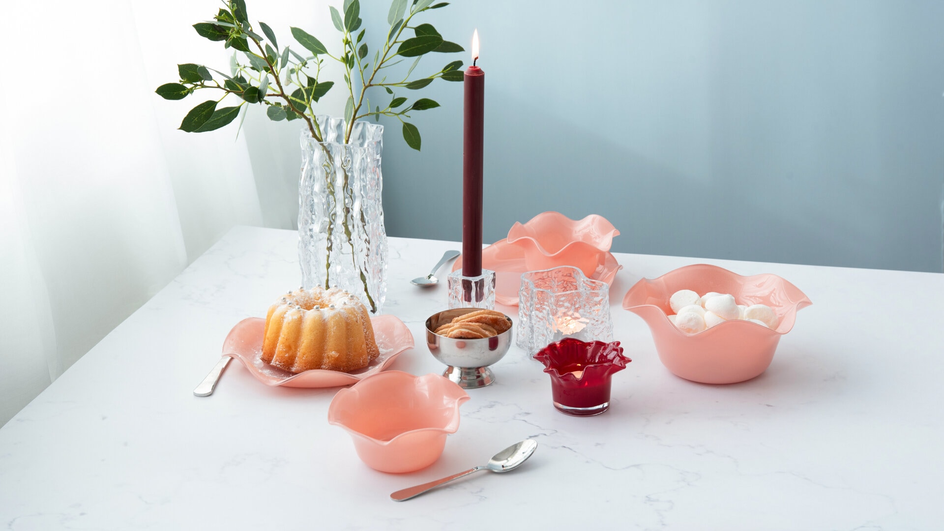 Under våren 2026 får dukningen ta plats och bli en del av inredningen. Porslinsserien Flow är kollektionens tydliga statement, med sin vågiga kant och varma persikoton. Serien är lika fin till vardagsmiddagen som till dessert och snacks när gästerna dröjer sig kvar runt bordet.