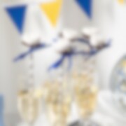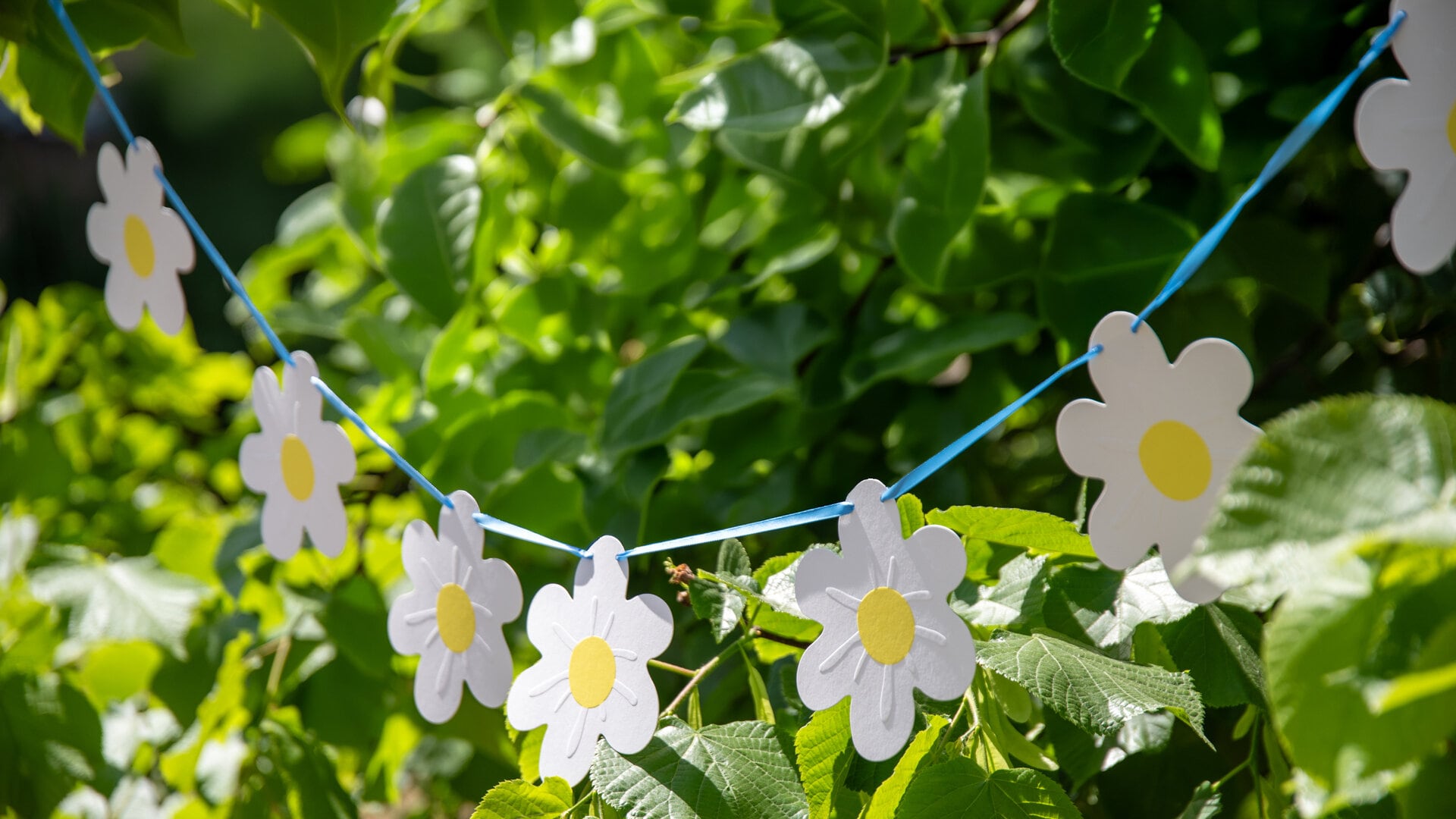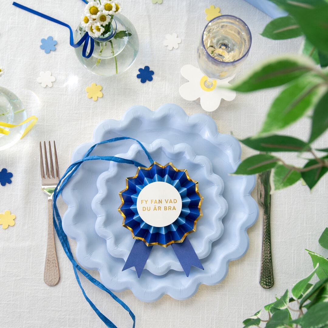 Blanda girlanger, vimplar och ballonger i blått och gult för en klassisk studentkänsla. Våga addera personliga budskap som sticker ut. En girlang med text som “Fy fan vad du är bra” ger både värme och glimten i ögat.