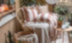 Mixa olika material och färger som du själv gillar för att ge balkongen en personlig touch och ställ gärna ut en korg att förvara filtarna i när de inte används.