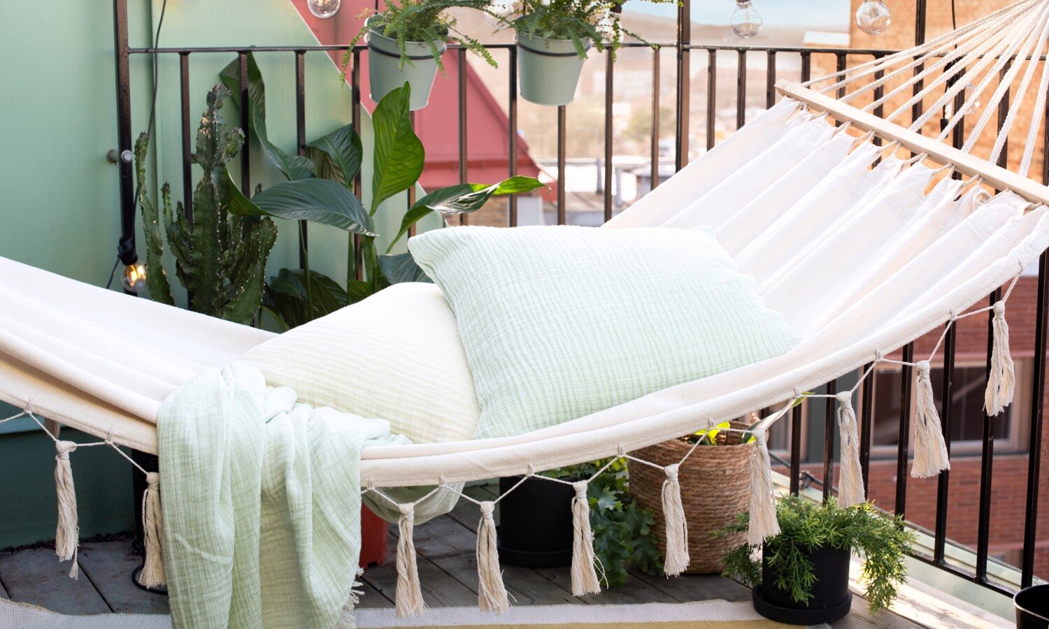 Slappna av, läs en bok och njut av livet medan du gungar harmoniskt i en hängmatta på din alldeles egen balkong. Vare sig du har en stor eller liten balkong så brukar det med lite vilja gå att få dit en hängmatta som du hänger i taket, på balkongräcket eller i en ställning.