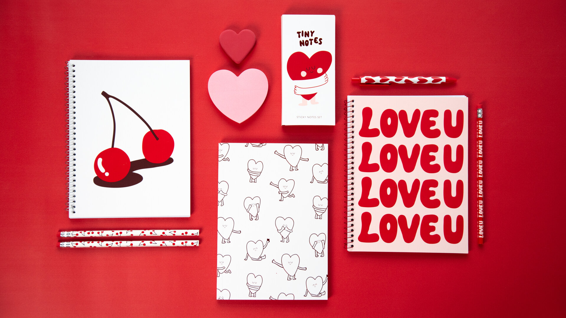Anteckningsblock, dagböcker och pennor har fått uppdaterade uttryck i årets kollektion. De hjärtformade notislapparna är perfekta för små kärlekshälsningar: