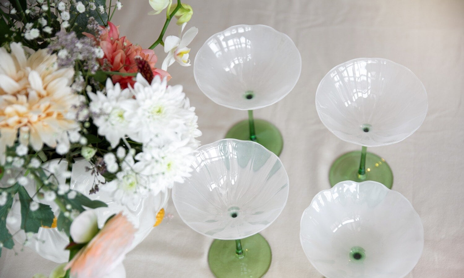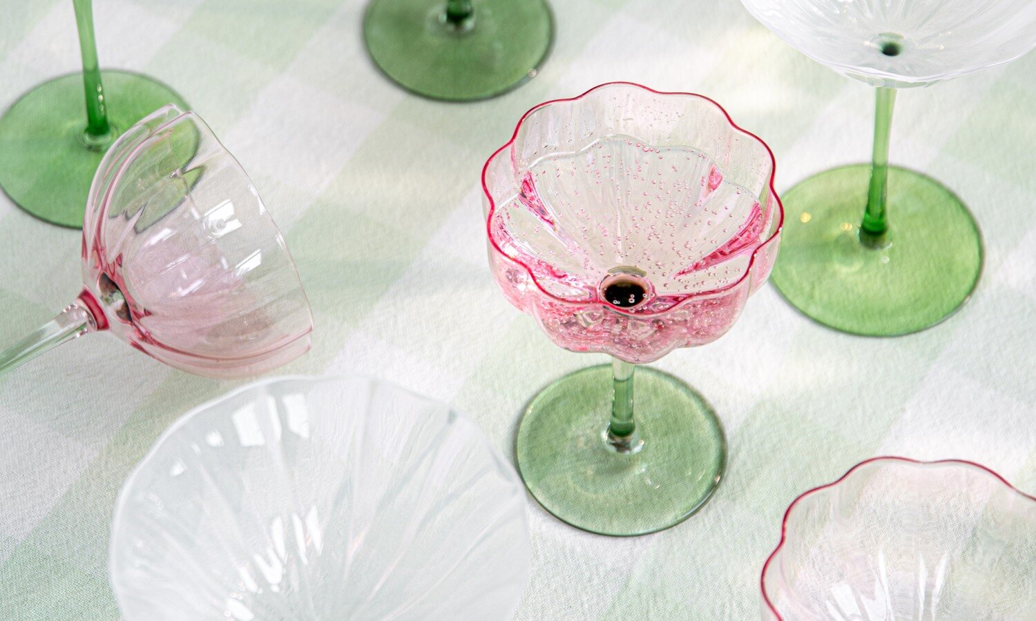 Färgat glas fortsätter att dominera vårens dukningar. Champagneglaset Flora driver maximalismen framåt med ett uttryck som tar plats, medan Tulip-serien erbjuder klockade former i dricks-, vin- och champagneglas som direkt ger bordet en tydlig riktning. Små detaljer som glasmarkörer och glasskedar blir subtila accentpunkter som knyter ihop helheten.