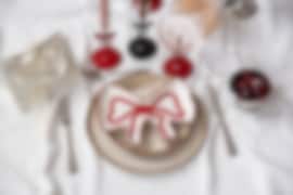 Skapa en trendig och lyxig dukning genom att kombinera hårt med mjukt – som kromade metaller och glansiga sidenband. Denna dukning blandar silver, rosetter och läppstiftsröda accenter med en neutral bas för en stilsäker och kontrastrik look.